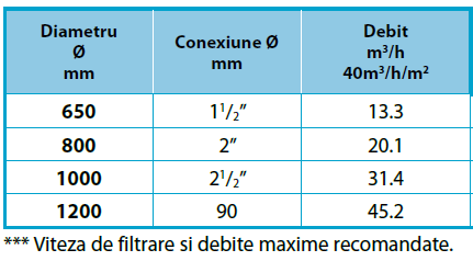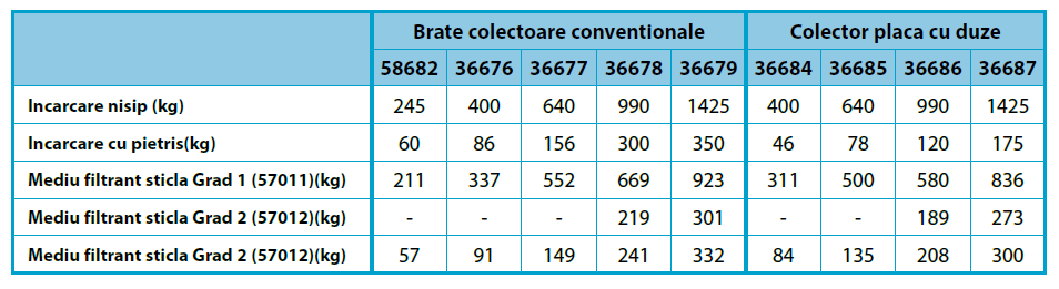Dispune de un pat de filtrare de 1 m și este disponibil fie cu sisteme colectoare laterale, fie cu duze.